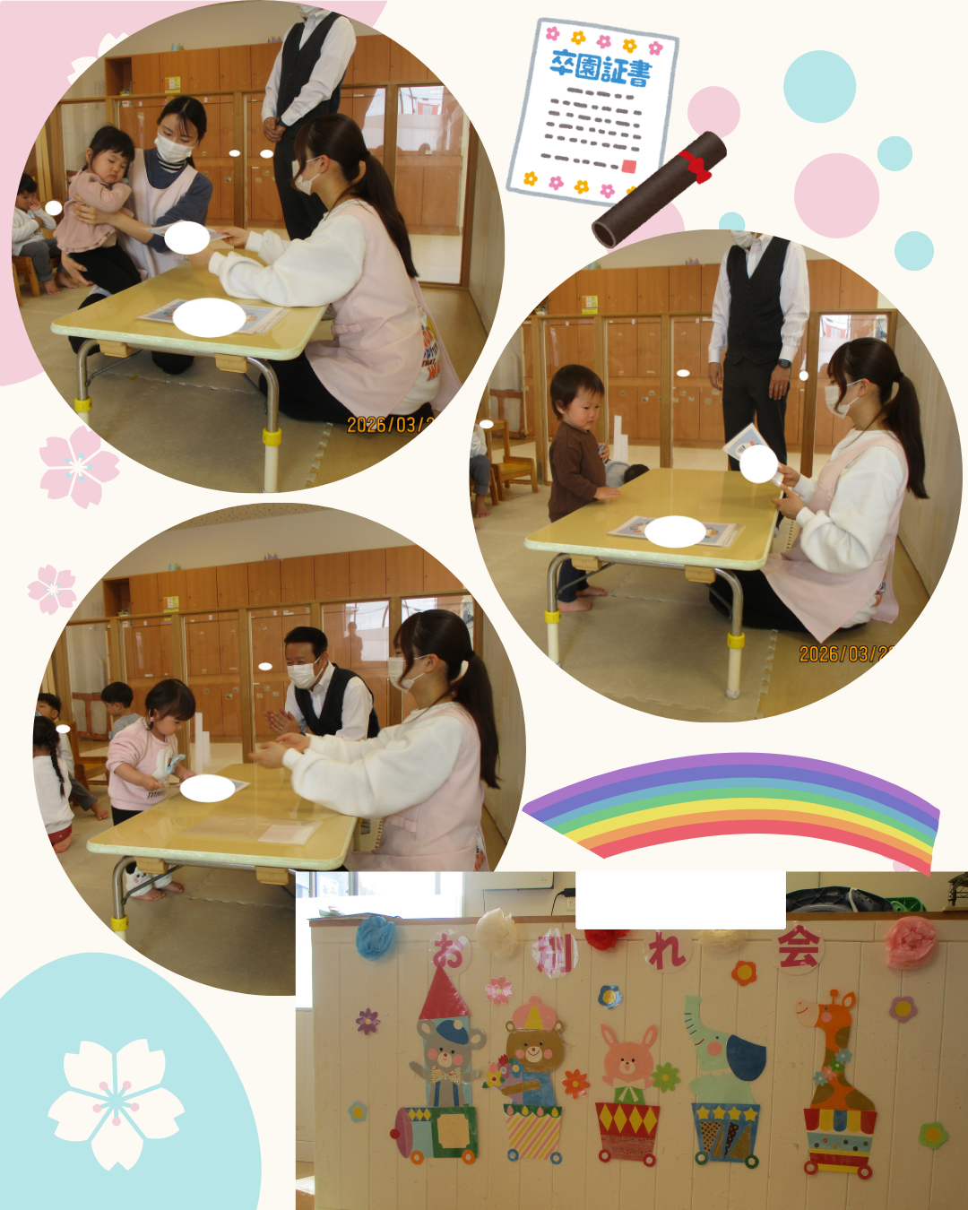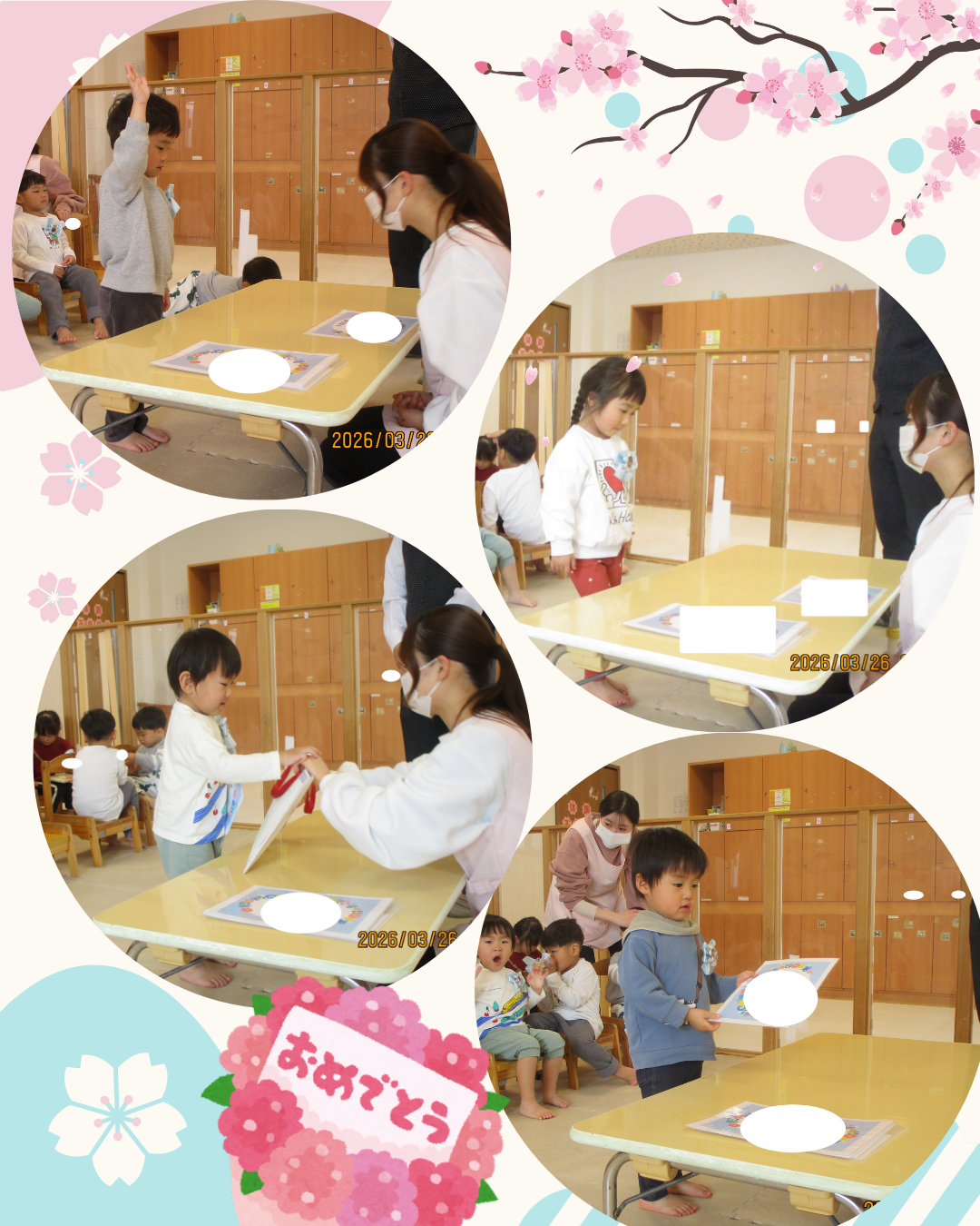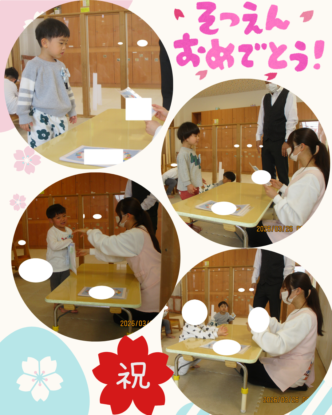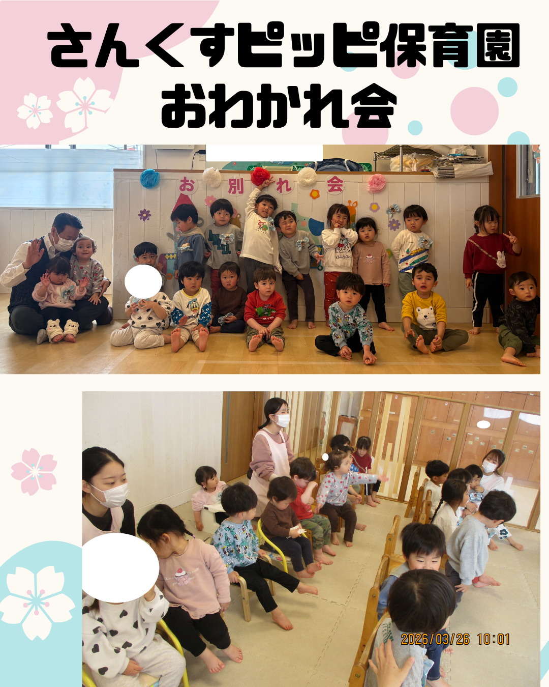 【さんくすピッピ保育園】 2026.04.02 その他 さんくすピッピ保育園です。 先日おわかれ会を行いました😊 すっかりお兄さんお姉さんになって職員一同嬉しく思います❤️ 1人ずつお名前を呼ばれると前に出て卒園証書を受け取りました✨ その後は園長先生のお話をきき、 歌をうたって踊って記念撮影して楽しい時間を過ごせました🌈 前の記事を見る 一覧へ戻る この記事をシェアする: