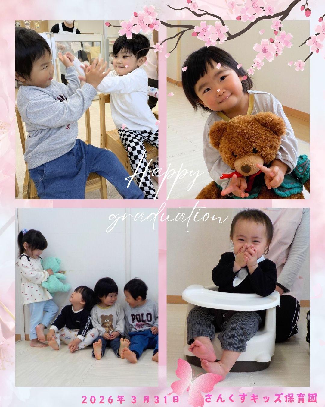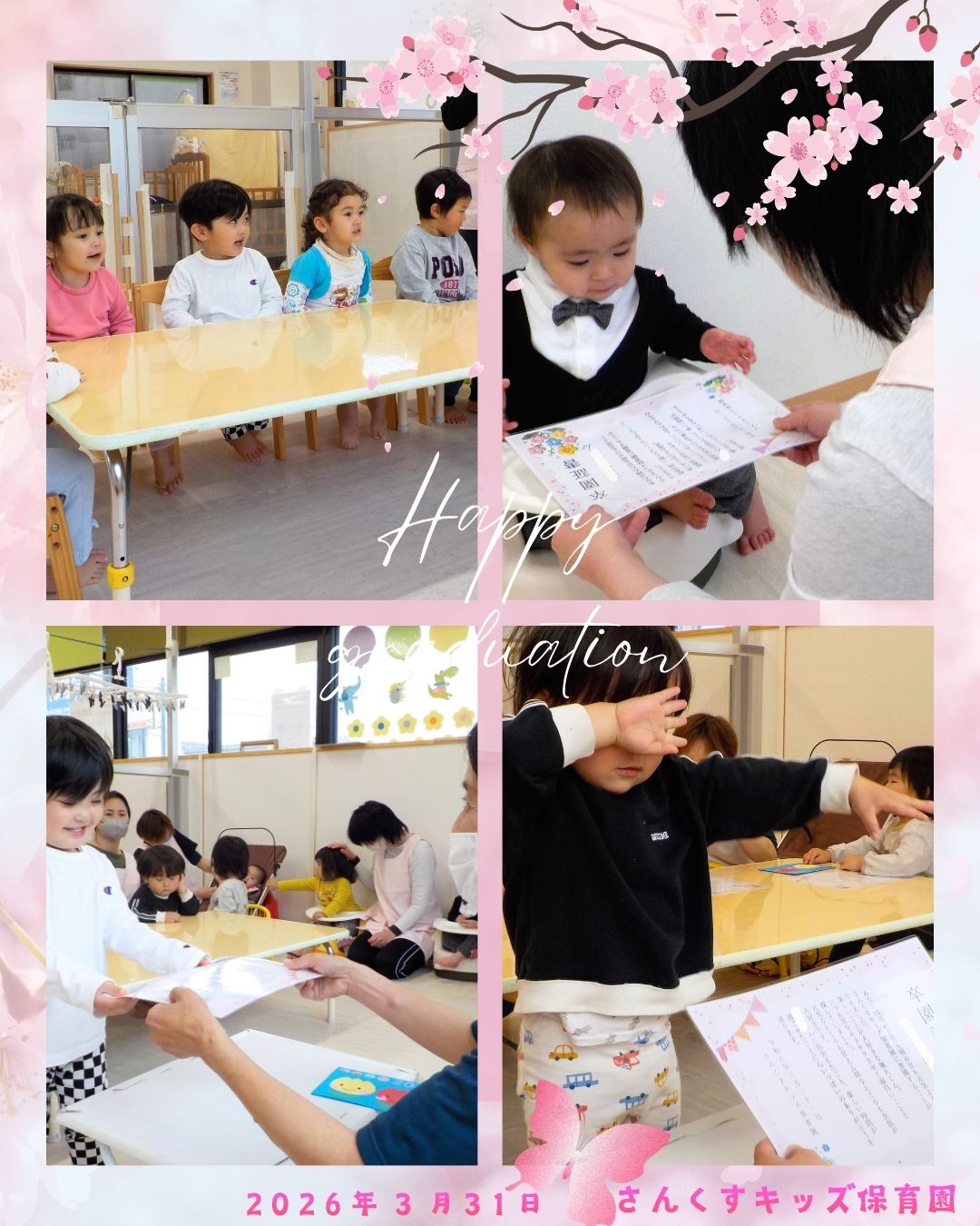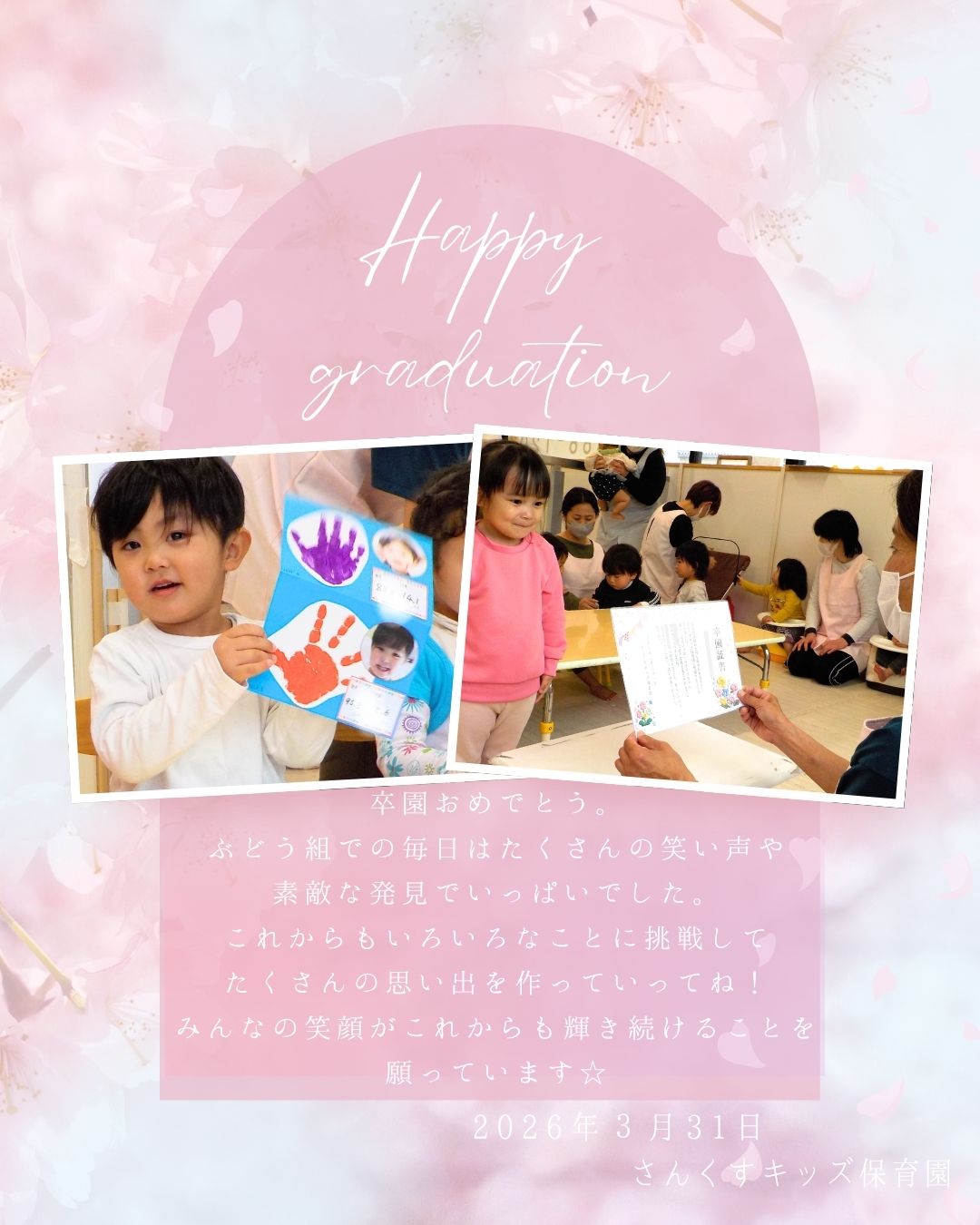 【さんくすキッズ保育園】 2026.04.07 お知らせ 令和7年度卒園式 こんにちは。さんくすキッズ保育園です😊 令和7年度卒園式が行われました。 楽しいこともちょっぴり涙した日もすべてが大切な思い出です。 これから始まる新しい毎日が、笑顔溢れる素晴らしいものになりますように✨ 卒園おめでとう🎉 前の記事を見る 一覧へ戻る この記事をシェアする: