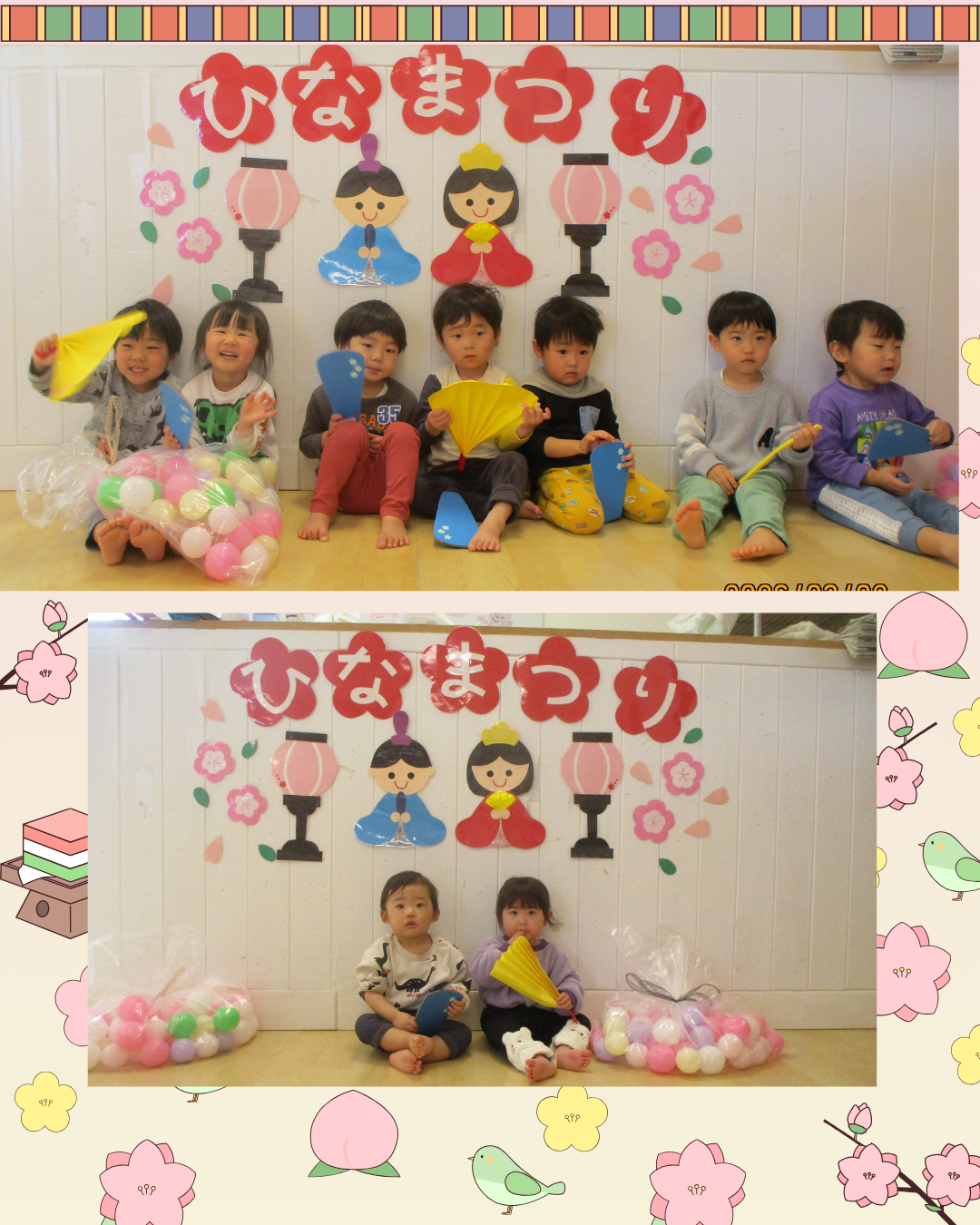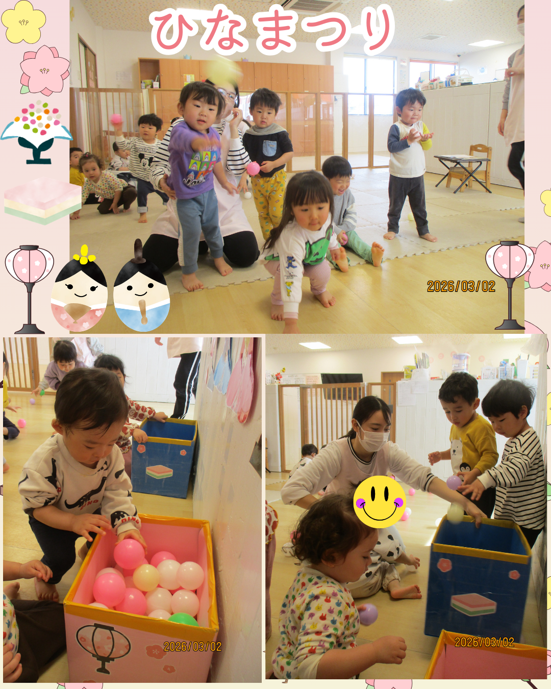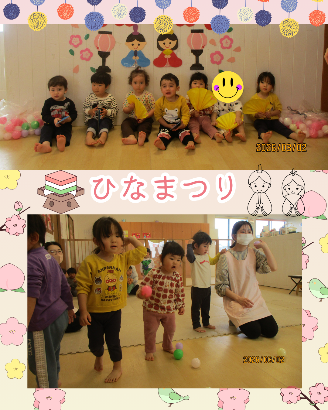 【さんくすピッピ保育園】 2026.03.10 保育園事業 こんにちは✨さんくすピッピ保育園です。 先週のひなまつりの様子になります😀 朝のおやつもひなまつり仕様で キャラメルコーンもも味で「ピンクだあ」「これなにー」と嬉しそうな声が聞こえていました。 ひなまつりの絵本の読み聞かせや玉入れゲーム、うれしいひなまつりを歌い 記念撮影をしました😊 ひなまつりは女の子の健やかな成長と厄除けを願う行事だそうです。 前の記事を見る 一覧へ戻る この記事をシェアする: